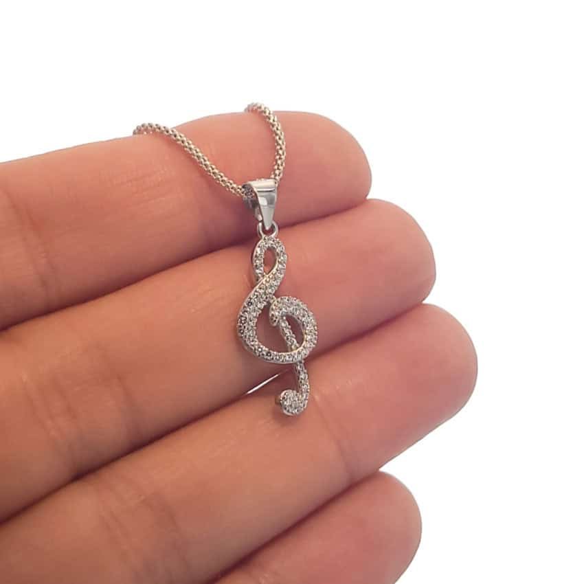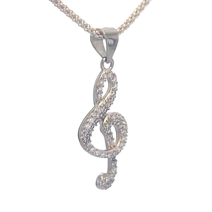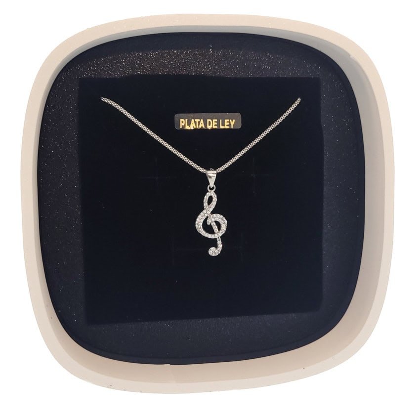 Joya realizada en plata 925 con baño de rodio y tapizada por su cara principal por multitud de circonitas brillantes. Esta pieza posee el diseño del símbolo musical clave de sol. El asa es móvil, de un diámetro interior de 4 milímetros.